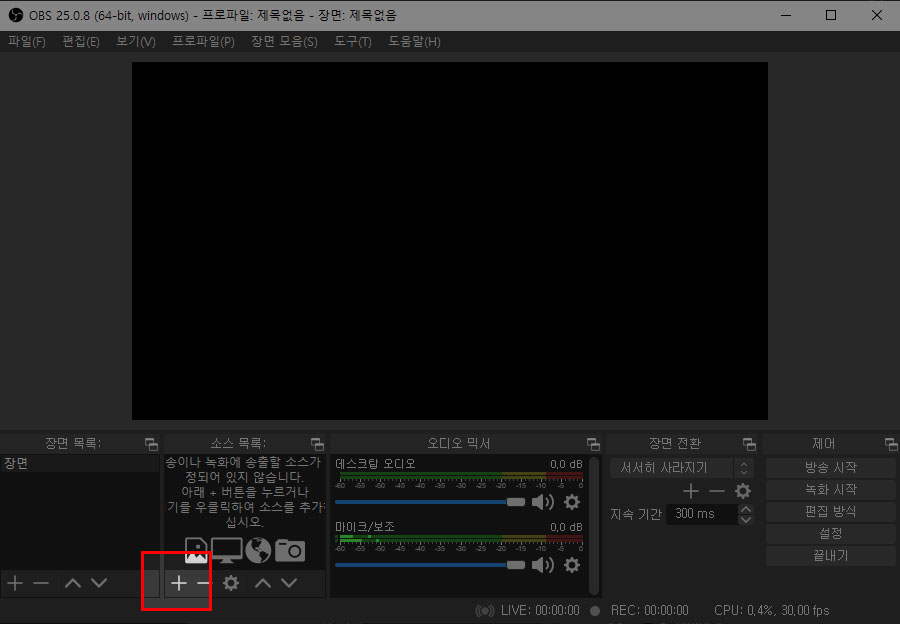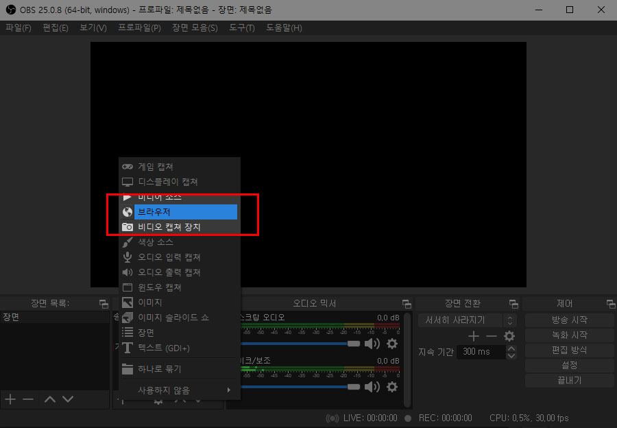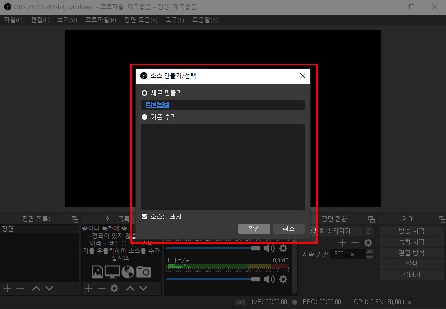 OBS Studio에 유투브, 트위치, 아프리카TV 등등의 플랫폼과 연동하여 채팅창을 투명하게 넣는 방법입니다. 여기서는 아프리카 도우미를 이용하는 방법을 설명드리겠습니다. 먼저 OBS Studo를 실행해서 채팅창을 넣기 위한 브라우저 소스 추가부터 시작하겠습니다.