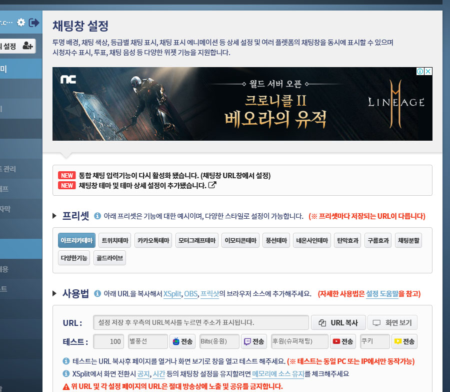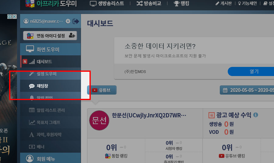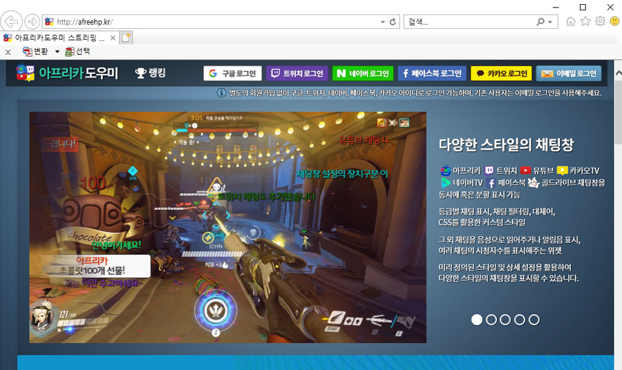 아프리카도우미 액세스를 허용해주어야 채팅창 삽입이 가능합니다.