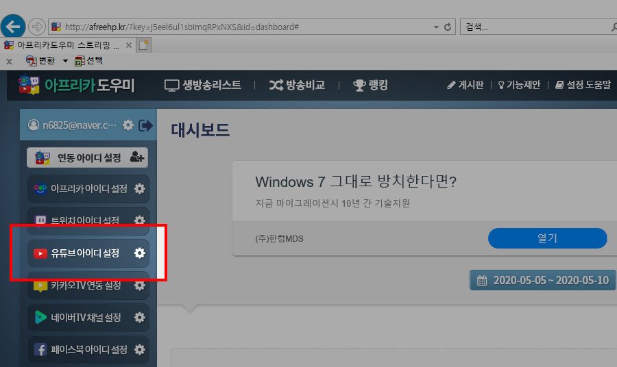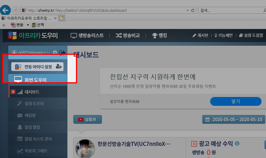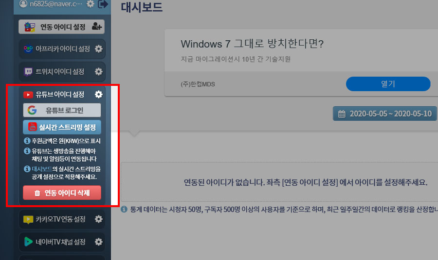 로그인을 하면 왼쪽에 연동 아이디 설정을 눌러서 채팅창을 넣고 싶은 사이트들을 로그인 해야 합니다.